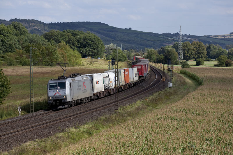 Im Maintal bei Thüngersheim wird ein KLV-Zug (Kombinierter Ladungs-Verkehr) von der TXL 185 531-1 gen Süden gefahren. 17. Oktober 2006 | ||