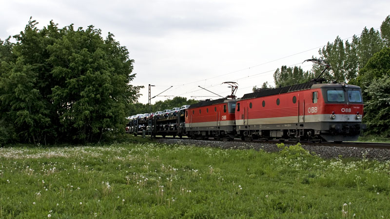 Ein hier sehr seltendes 1144-Tandem!! Die ÖBB 1144 223-5 und 1144 239-4 in Diensten der TXL hatten einen schweren langen BMW-Zug ("Millionenzug") nach Bremerhaven am Haken. Bremen Mahndorf, 14. Mai 2008 | ||