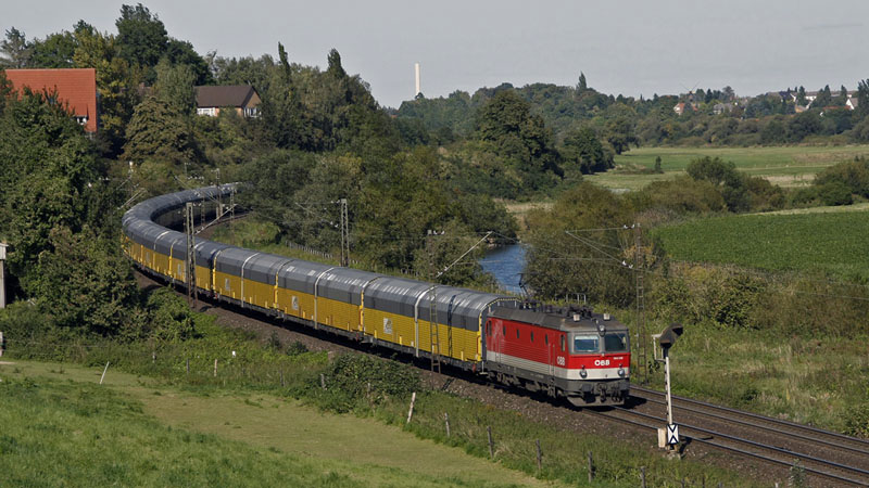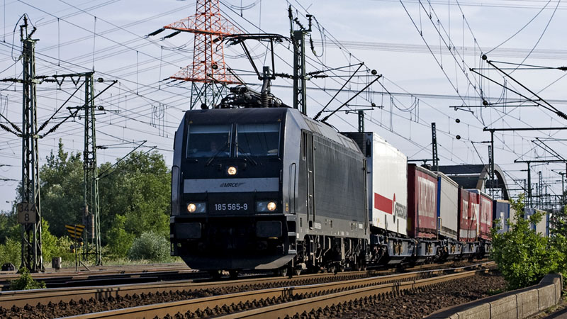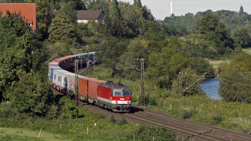 dem Fahrdrahtverhau fuhr die 185 565-9 ganz souverän mit ihrem KLV-Zug