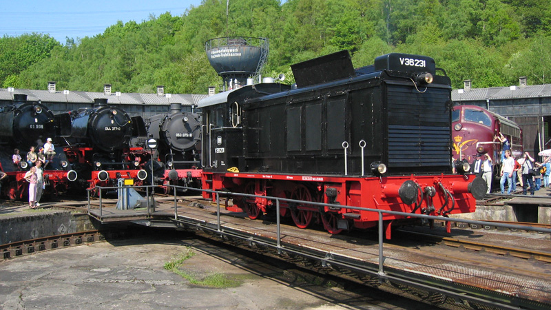 Die bestens gepflegte V36 231 des Eisenbahnmuseums Bochum Dahlhausen blubbert mit ihrem Originaldiesel auf der Drehscheibe vor all den Dampfloks des Museums und der ehemaligen dänischen Nohab Diesellok. 1. Mai 2005